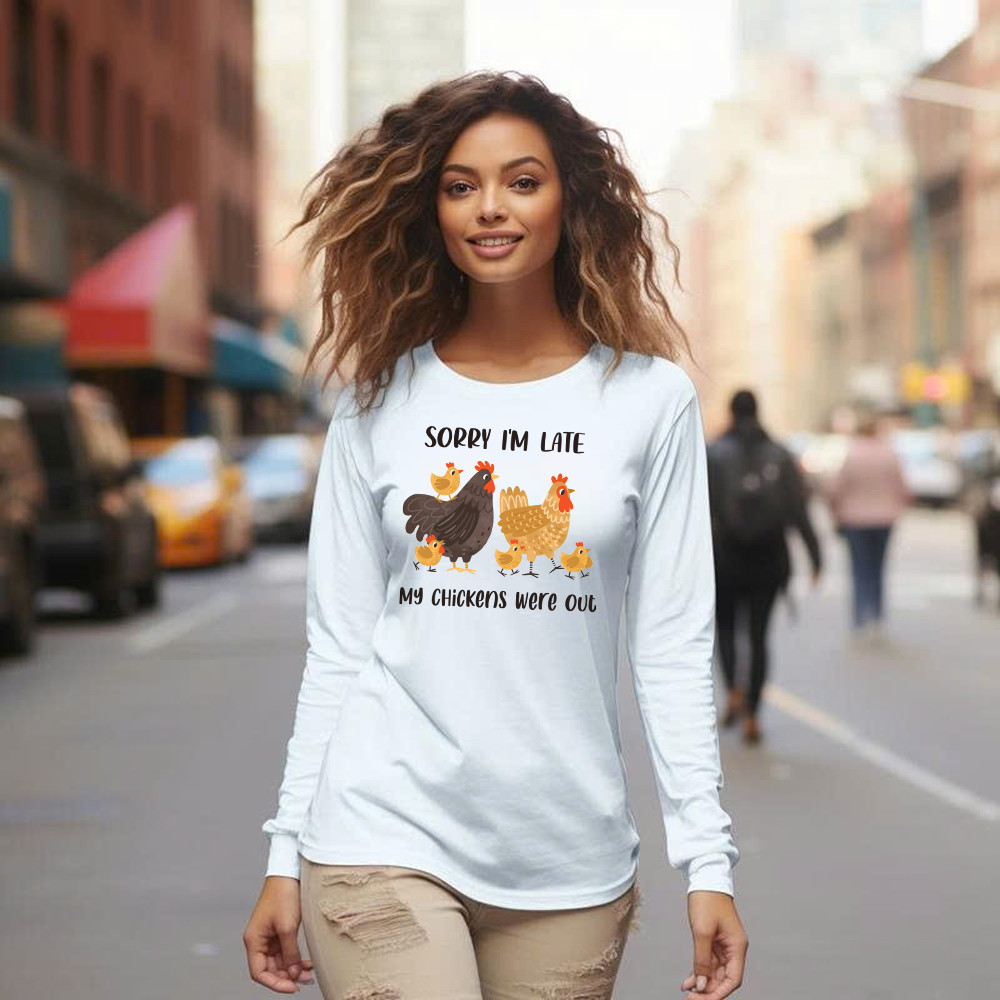 Sorry I’m Late My Chickens Were Out Long Sleeve Shirt Funny Sayings Shirt Gifts For Chicken Farmers.